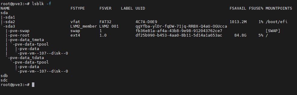 lsblk -f # includes filesystem type, label, UUIDwhen using lsblk in the case below you can see two physical drives, taht are not yet bound to the proxmox host system pve3.